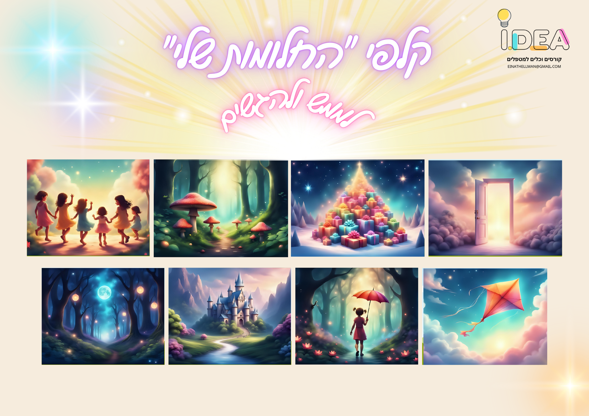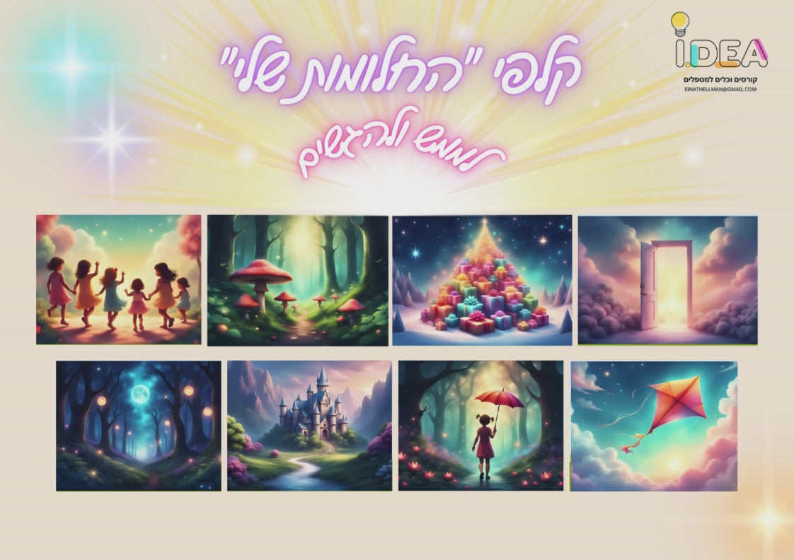 ערכת קלפים דיגיטלית להדפסה לילדים, ובה תמונות קסומות של מקומות ונופים חלומיים. הקלפים מזמינים את הילדים לצאת למסע בדמיון, לגלות כוחות פנימיים, לבטא רגשות ולחבר בין חלום לפעולה קטנה במציאות. הערכה מתאימה לעבודה אישית, קבוצתית, בקליניקה, בכיתה וגם בבית עם ההורים. כיוון שהיא דיגיטלית – ניתן להדפיס את הקלפים שוב ושוב, לשלב אותם בציור, קולאז' או כתיבה יצירתית, ולהפוך כל שימוש לחוויה חדשה. כלי ייחודי שמפתח דמיון, מחזק ביטחון עצמי ומעודד שיחה רגשית בדרך מהנה ויצירתית. להלן הצעות ורעיונות לעבודה עם הערכה.